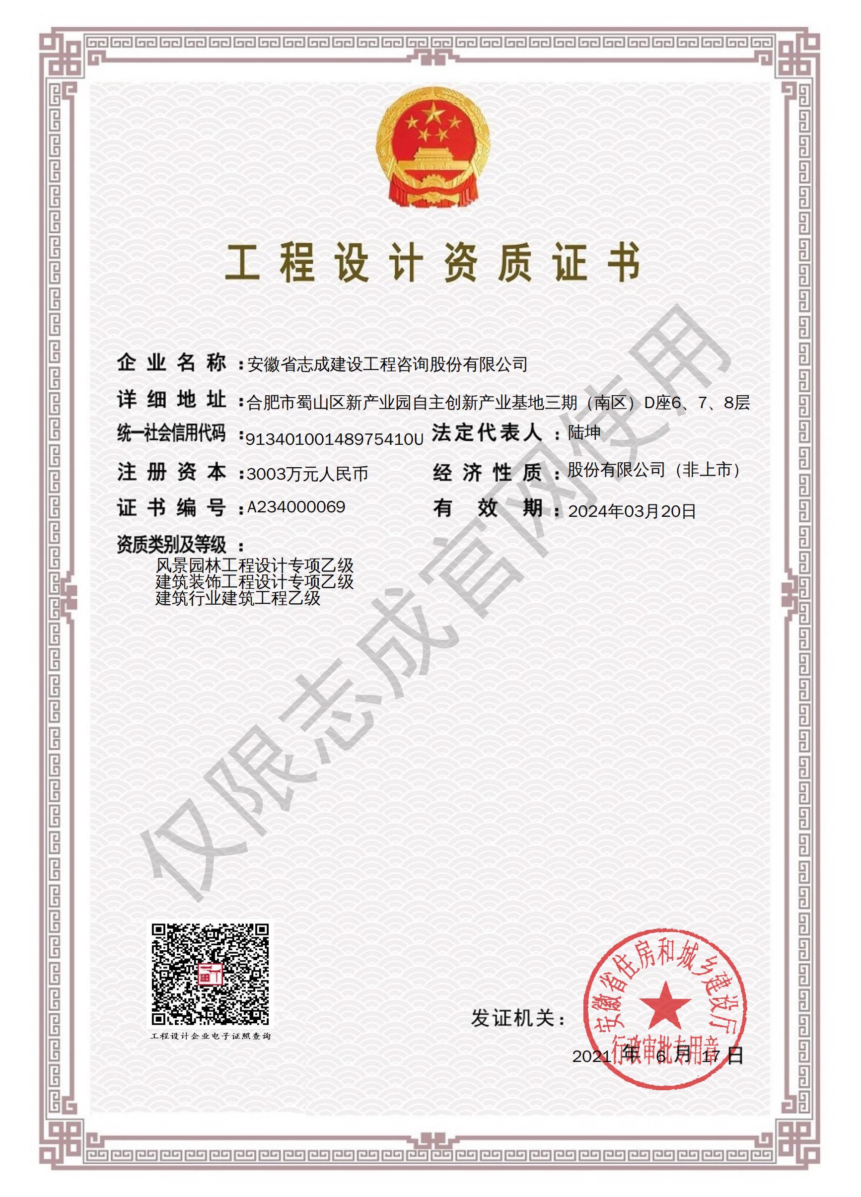 目前具有房屋建筑工程監(jiān)理甲級、市政公用工程監(jiān)理甲級、電力工程監(jiān)理甲級 、通信工程監(jiān)理甲級、機電安裝工程監(jiān)理乙級、建筑行業(yè)建筑工程設(shè)計乙級、風(fēng)景園林工程設(shè)計專項乙級、建筑裝飾工程設(shè)計專項乙級、工程咨詢單位乙級資信、工程招標(biāo)代理機構(gòu)甲級、工程造價咨詢甲級、建筑工程施工總承包貳級、市政公用工程施工總承包貳級、建筑裝修裝飾工程專業(yè)承包壹級、電子與智能化工程專業(yè)承包貳級等多種資質(zhì)。